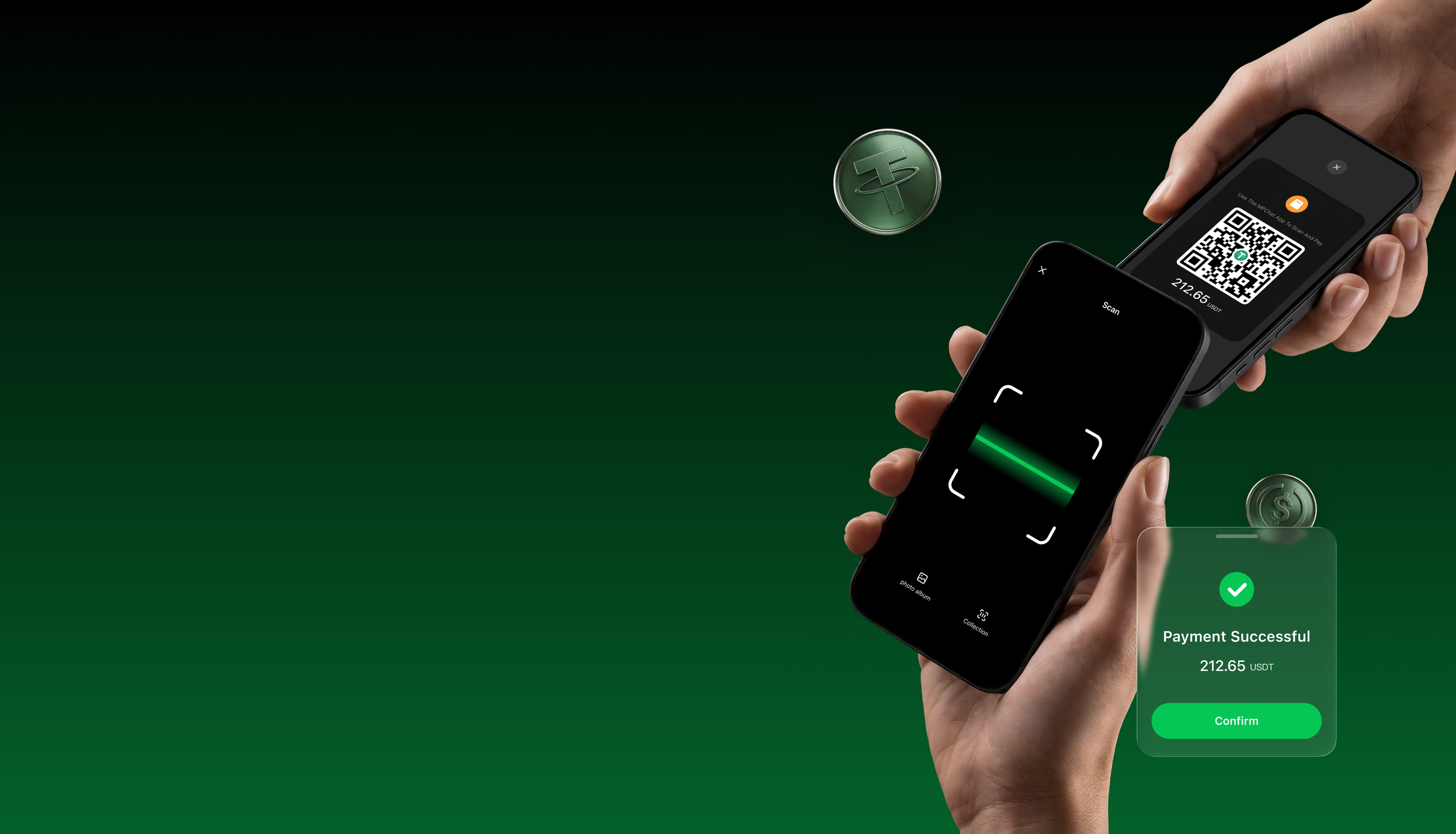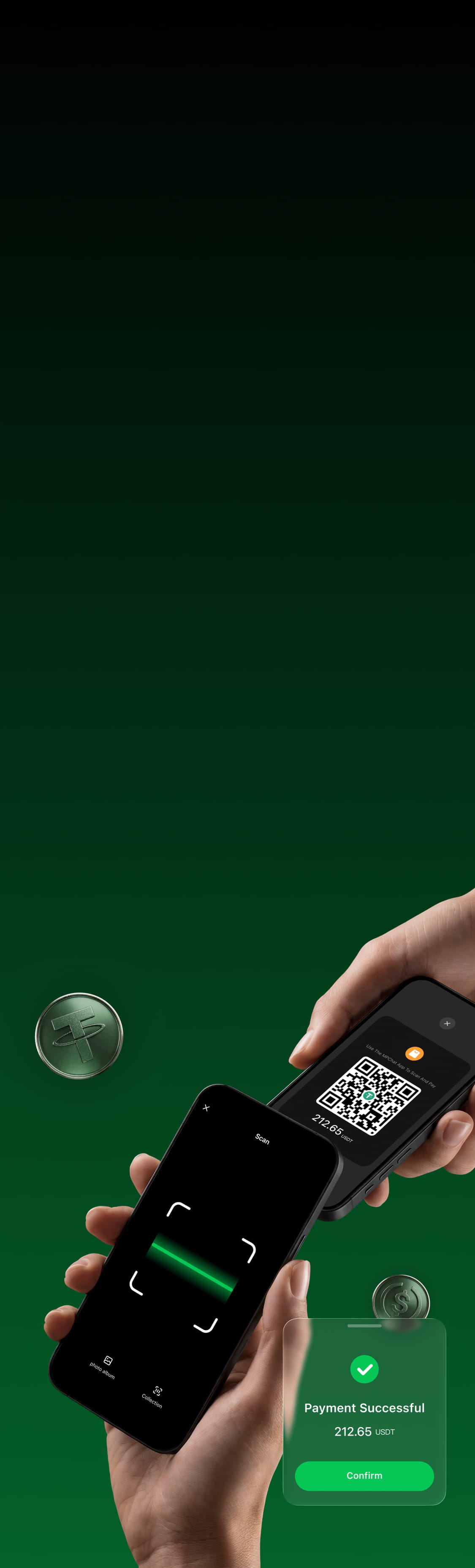 通过安全二维码进行即时稳定币支付。